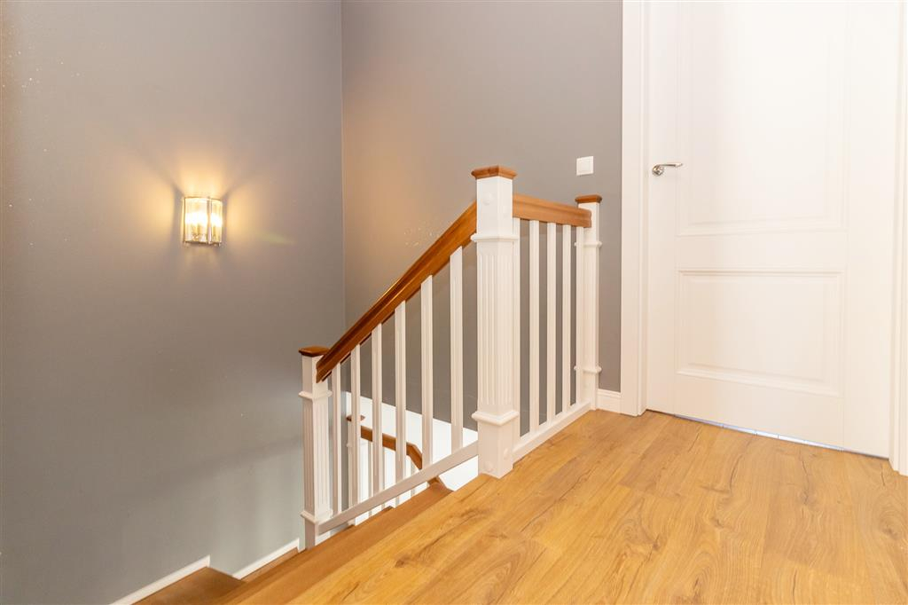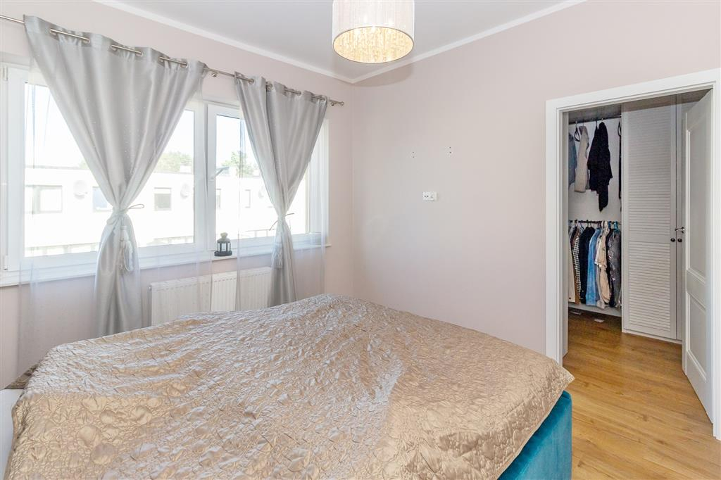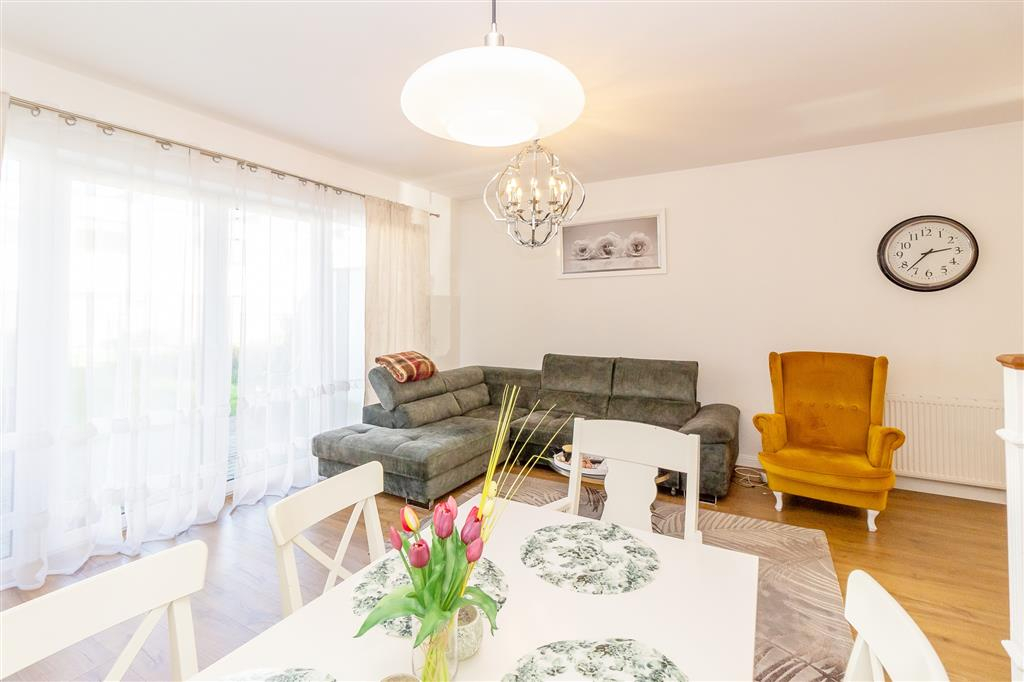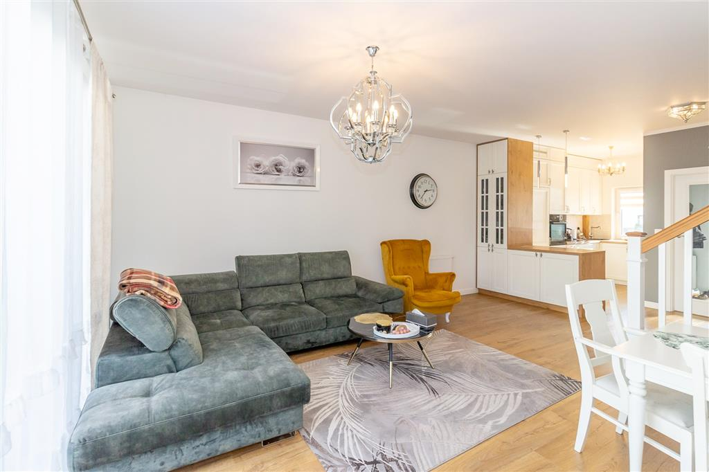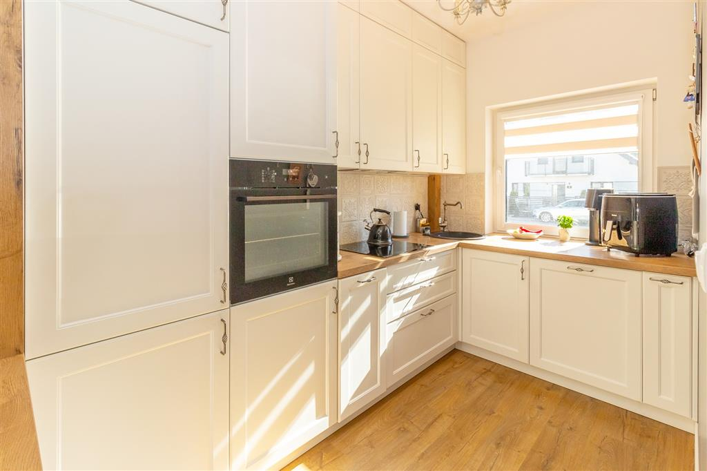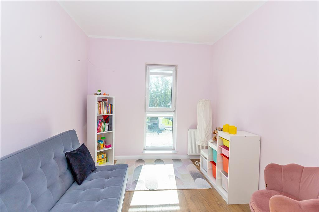Na parterze mamy wiatrołap, przestronny salon z otwartą kuchnią z którego wychodzimy na ogród. Na tym poziomie znajduje się również pomieszczenie gospodarcze w którym znajduje się piec gazowy (dwufunkcyjny) oraz pomieszczenie WC. Na piętrze znajdują się 3 sypialnie ( jedna z garderobą), duża łazienka oraz przedpokój.