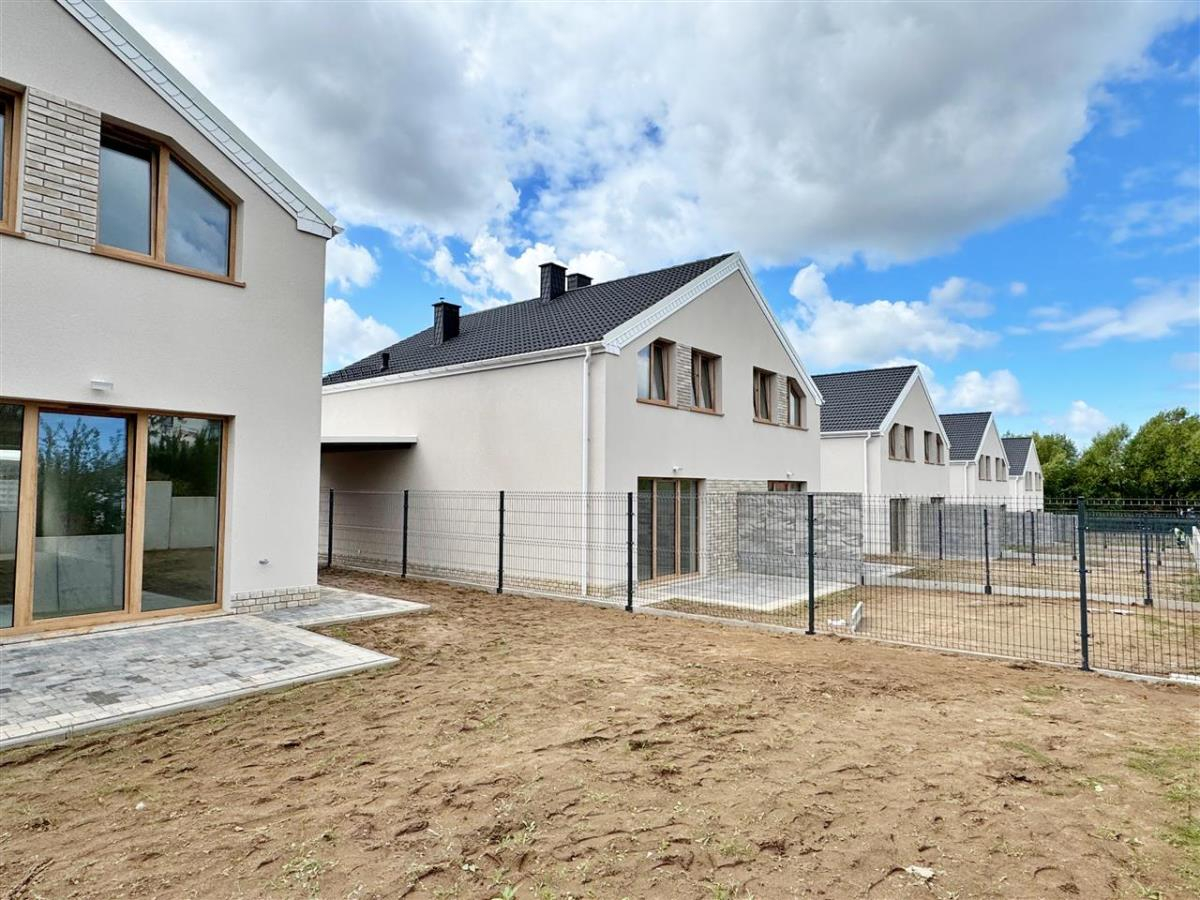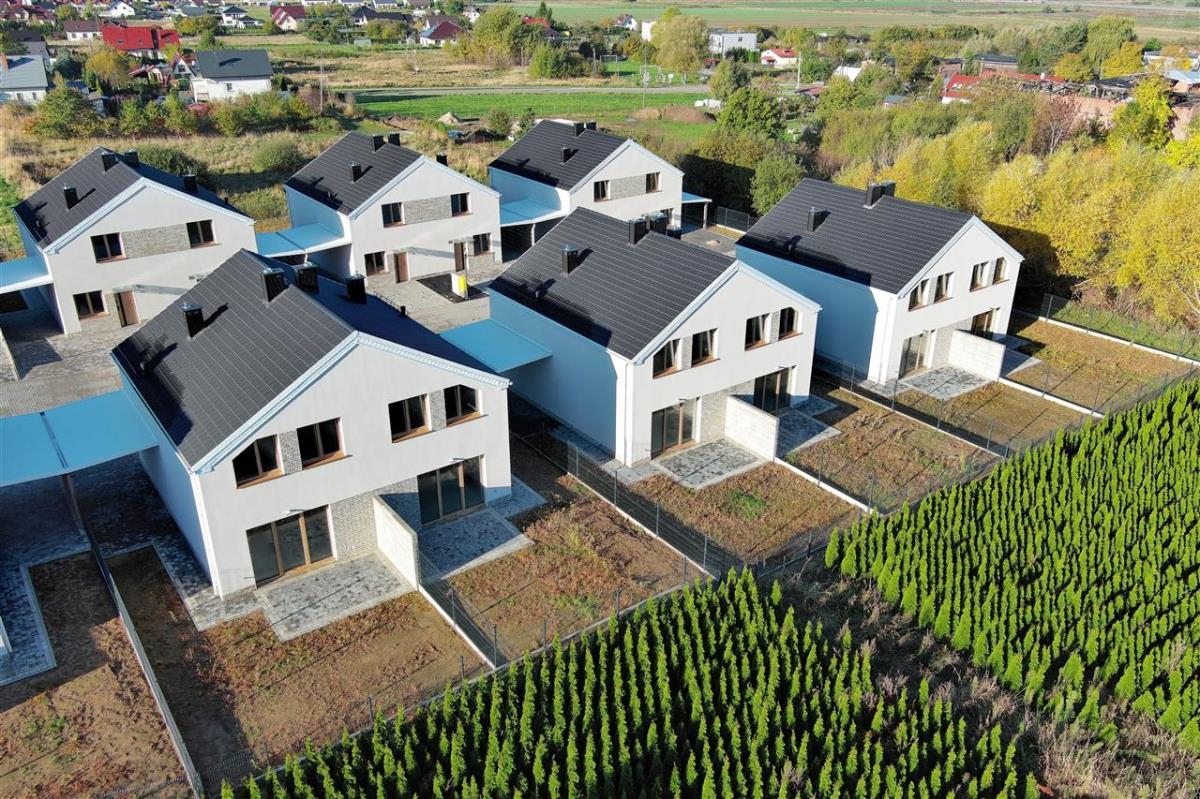 Wykończenie w standardzie developerskim – idealne dla osób, które chcą stworzyć wnętrza dopasowane do własnego gustu: tynki maszynowe, wtyczki, kontakty, ogrzewanie indywidualne gazowe- podłogowe firmy Tece wraz z piecem 2-funkcyjnym 24 kW firmy DE Dietrich ze sterownikiem. Dodatkowo w łazience i wc na parterze kaloryfer – drabinka. Stolarka okienna firmy Veka w kolorze Dąb WOODEC TURNER strona zewnętrzna, od wewnątrz w kolorze białym. Rozprowadzona instalacja do podłączenia urządzeń. Instalacja RTV - w każdym pokoju gniazdko RTV. Wykonane podejście do kominka. Dach: dachówka cementowa. Drzwi wejściowe antywłamaniowe. Schody wewnętrzne wylewane betonowe. Dojście do budynku oraz teren przed nim wyłożony kostką polbrukową lub ażurową. Brama wjazdowa (szlaban) na pilota. Wydzielone ogródki (określony sposób do korzystania). Budynek niepodpiwniczony.