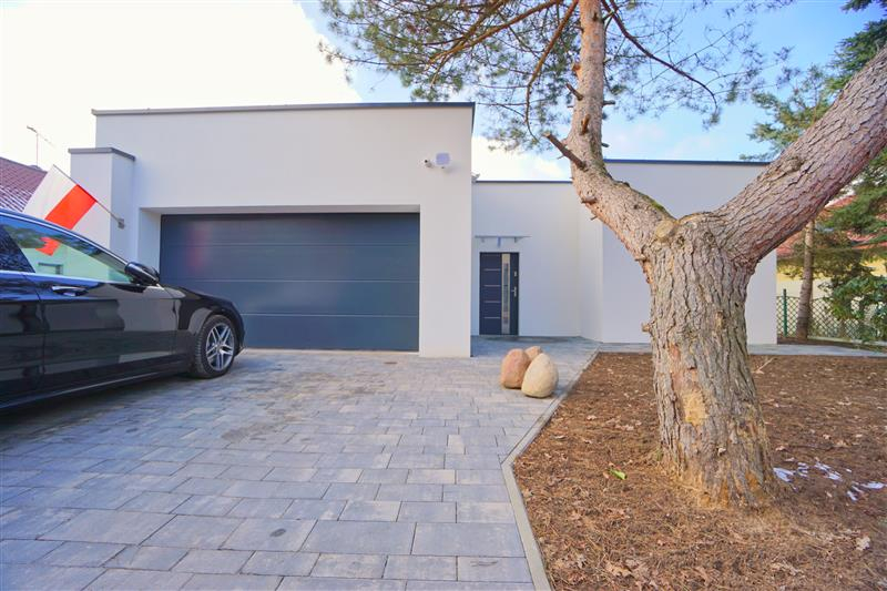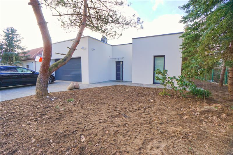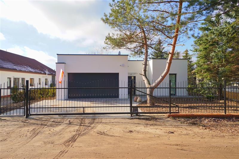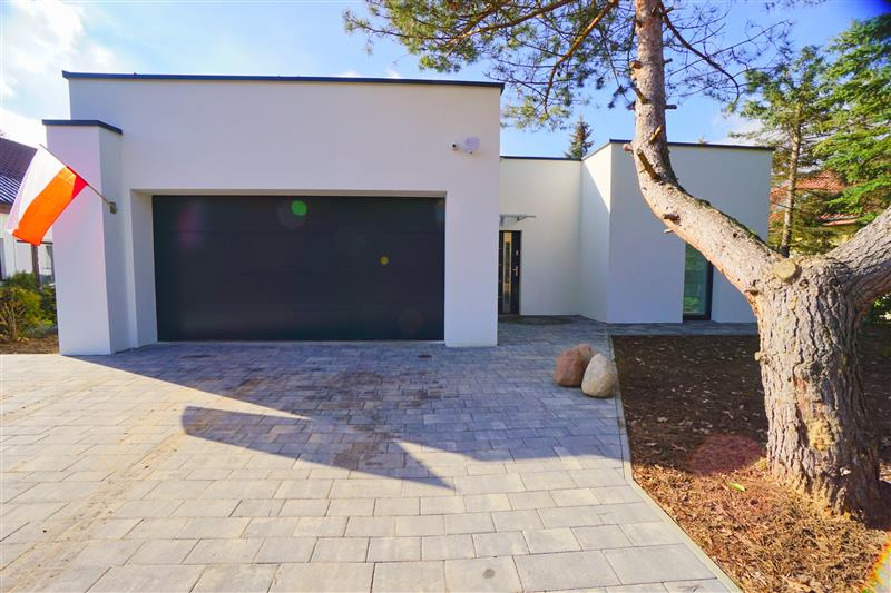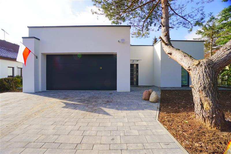 Nowy parterowy budynek o powierzchni użytkowej 139m2, o nowoczesnej bryle z płaskim dachem, najnowsze rozwiązania grzewcze.
