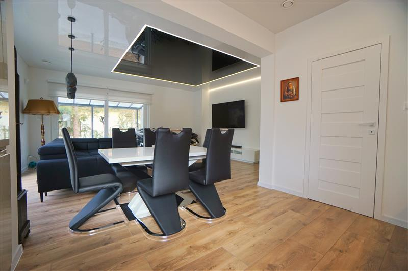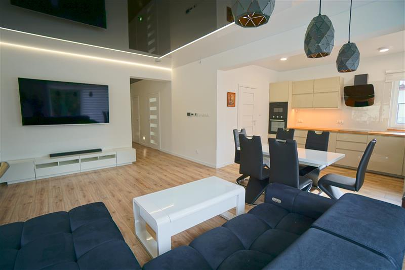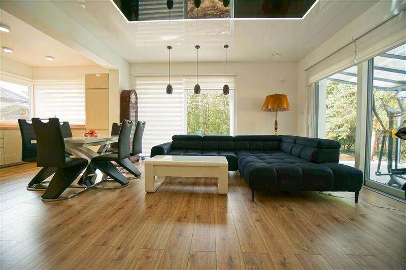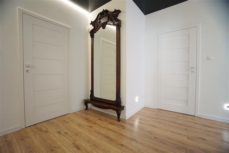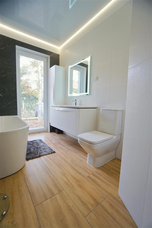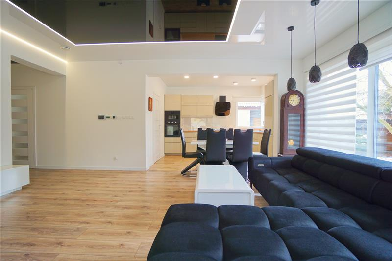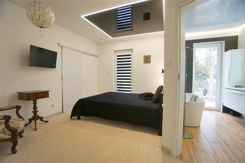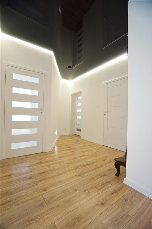 Sufity napinane w każdym pomieszczeniu o zróżnicowanej strukturze kolorystycznej ( w kuchni biały mat, w salonie białe elementy z czarnym w połysku, korytarze czarne, łazienki białe). Oświetlenie led wykorzystane w aranżacji wnętrza sterowane z poziomu aplikacji. Na podłogach panel oraz terakota w wiatrołapie i łazienkach. Łazienki wykonane w nowoczesnej aranżacji, jasne elementy łączone z drewnopodobną glazurą lub ciemną płytką. Ściany w kolorze białym.