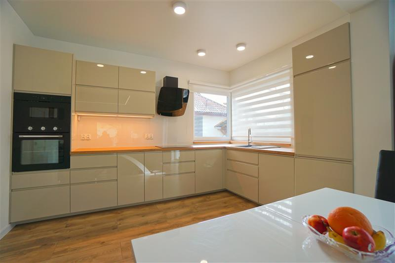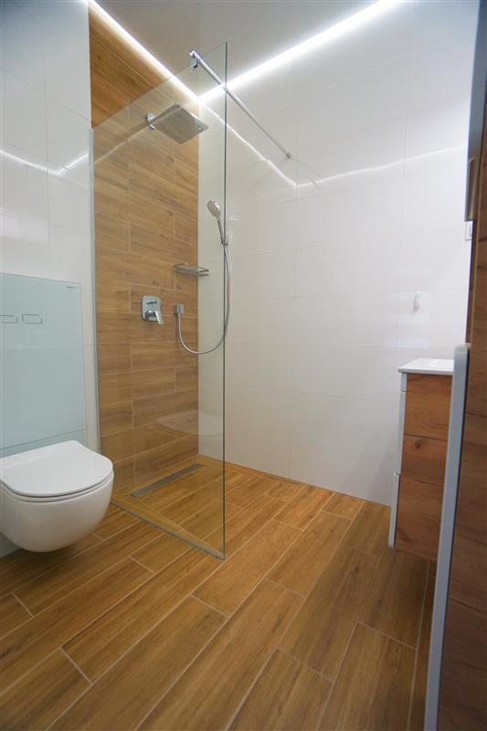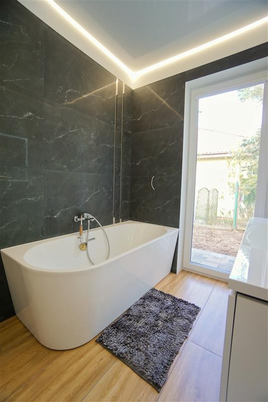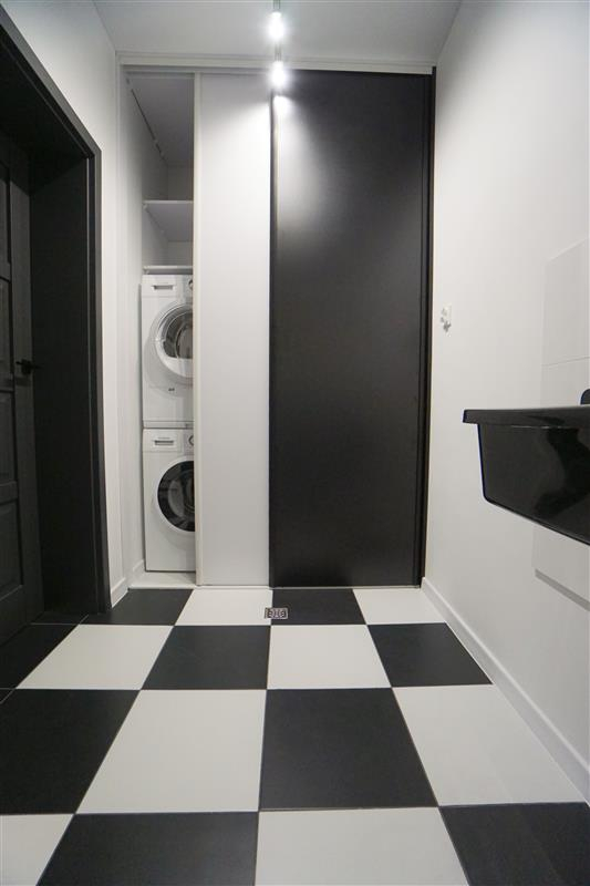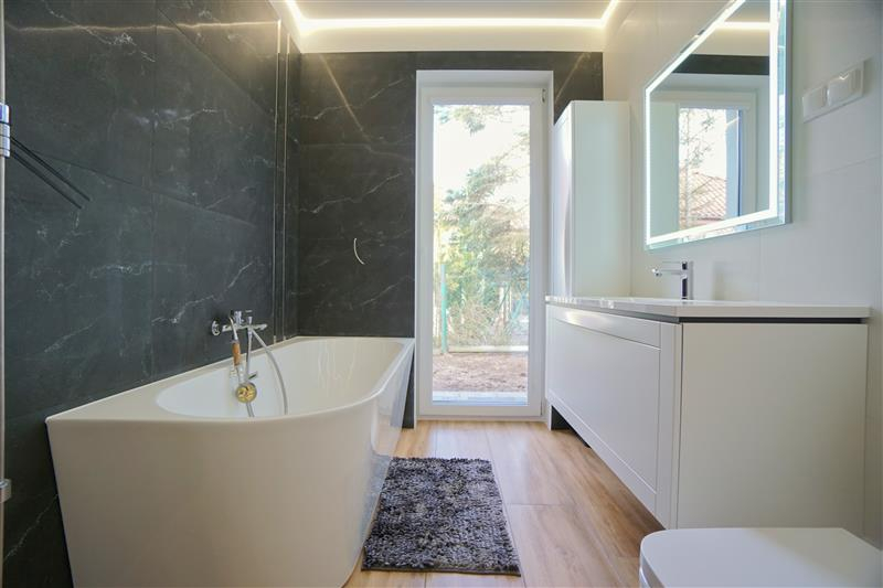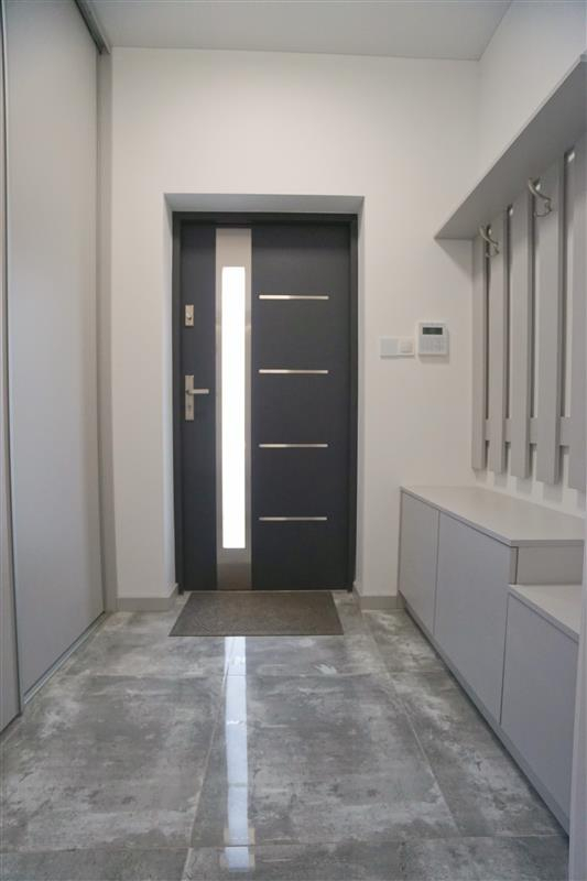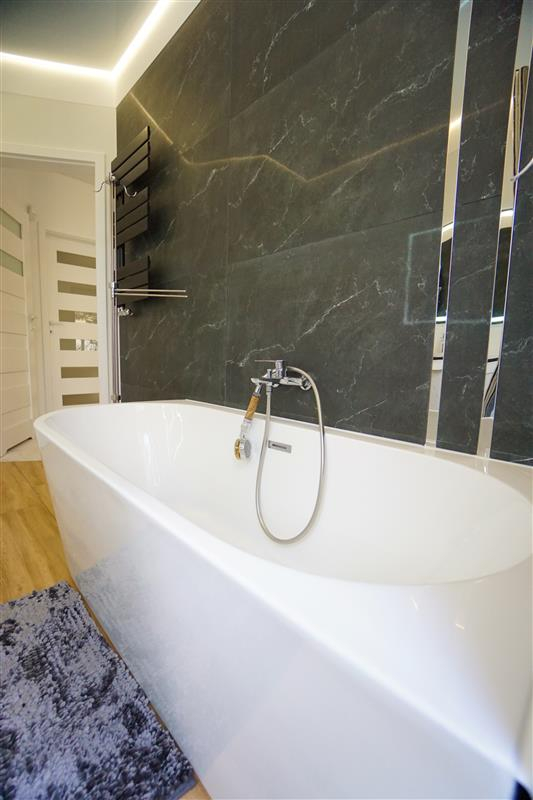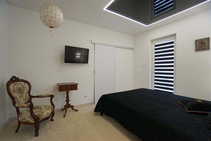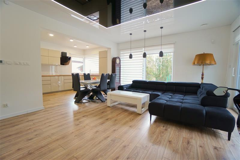 Sufity napinane w każdym pomieszczeniu o zróżnicowanej strukturze kolorystycznej ( w kuchni biały mat, w salonie białe elementy z czarnym w połysku, korytarze czarne, łazienki białe). Oświetlenie led wykorzystane w aranżacji wnętrza sterowane z poziomu aplikacji. Na podłogach panel oraz terakota w wiatrołapie i łazienkach. Łazienki wykonane w nowoczesnej aranżacji, jasne elementy łączone z drewnopodobną glazurą lub ciemną płytką. Ściany w kolorze białym.