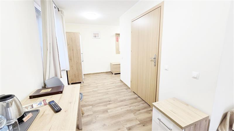 Bardzo ładnie doświetlony. W oknach żaluzje. Na wyposażeniu : czajnik elektryczny, stół, krzesła.